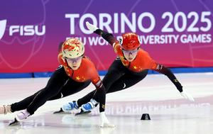 (250120) -- TURIN, 20 enero, 2025 (Xinhua) -- La patinadora de velocidad sobre pista corta, Song Yifei (d), de China, asiste a una sesión de entrenamiento previo a la competencia de patinaje de velocidad sobre pista corta en los Juegos Mundiales Universitarios de Invierno de la FISU Turín 2025, en Turín, Italia, el 20 de enero de 2025. (Xinhua/Zhang Chen) (rtg) (ah) (vf)