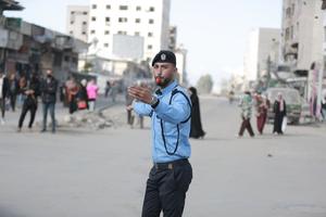 (250120) -- GAZA, 20 enero, 2025 (Xinhua) -- Un miembro de la policía palestina de Hamás dirige el tráfico en una calle, en la Ciudad de Gaza, el 20 de enero de 2025. El Ministerio del Interior de Gaza, dirigido por Hamás, dijo el sábado en un comunicado que sus fuerzas de seguridad comenzarán a desplegarse por toda la Franja de Gaza en cuanto entre en vigor el domingo el acuerdo de alto el fuego a cambio de la liberación de rehenes. (Xinhua/Abdul Rahman Salama) (oa) (ah) (vf)