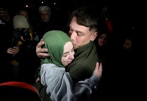 (250120) — RAMALLAH, 20 enero, 2025 (Xinhua) — Imagen del 19 de enero de 2025 de un hombre abrazando a una prisionera palestina liberada, en la localidad de Beitunia, cerca de la ciudad cisjordana de Ramallah. Israel liberó a 90 prisioneros palestinos de la prisión de Ofer, ubicada al oeste de Ramallah en Cisjordania, durante la madrugada del lunes, pocas horas después de que tres rehenes israelíes regresaran a Israel tras ser liberados por Hamás en Gaza. (Xinhua/Ayman Nobani) (oa) (ah) (ce)