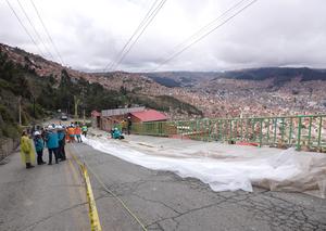 (250124) -- LA PAZ, 24 enero, 2025 (Xinhua) -- Vista aérea tomada con un dron el 23 de enero del 2025 de trabajadores colocando protecciones en el sitio de un deslizamiento de tierra debido a las fuertes lluvias, en Cotahuma, en La Paz, Bolivia. Más de 50.000 familias en ocho de los nueve departamentos de Bolivia han resultado afectadas hasta ahora por la temporada de lluvias iniciada desde noviembre del año pasado, informó el jueves el viceministro de Defensa, Juan Carlos Calvimontes. (Xinhua/Javier Mamani) (jm) (oa) (ra) (ce)