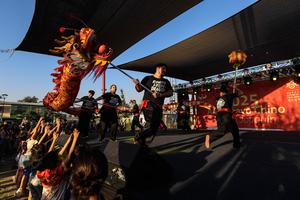 (250126) -- SANTIAGO, 26 enero, 2025 (Xinhua) -- Imagen del 25 de enero de 2025 de niños reaccionando durante una presentación de la danza del dragón en la celebración del Año Nuevo chino, en el municipio de San Joaquín, en Santiago, capital de Chile. Los habitantes del municipio chileno de San Joaquín, en el sector sur de la ciudad de Santiago, dieron por primera vez la bienvenida al Año Nuevo chino o Fiesta de la Primavera con danzas al compás del dragón chino y la práctica de artes marciales. (Xinhua/Jorge Villegas) (jv) (rtg) (ah)