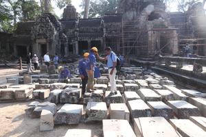 (250206) -- SIEM REAP, 6 febrero, 2025 (Xinhua) -- Imagen del 22 de enero de 2025 de trabajadores laborando en sitio de restauración de una galería en el Templo Ta Prohm, en la provincia de Siem Reap, Camboya. Los arqueólogos han estado restaurando la tercer galería en el lado oeste del templo Ta Prohm en el Parque Arqueológico de Angkor, enlistado en la UNESCO, en el noroeste de Camboya, de acuerdo con un comunicado de prensa de la Autoridad Nacional APSARA (ANA), el jueves. (Xinhua/ANA) (rtg) (ra) (vf)
