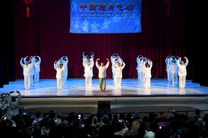 (250208) — LA HABANA, 8 febrero, 2025 (Xinhua) — Imagen del 7 de febrero de 2025 del maestro Roberto Vargas Lee (c-atrás), director de la Escuela Cubana de Wushu y Qigong, y alumnos realizando una presentación de artes marciales en celebración del Año Nuevo Lunar chino en el Teatro América, en La Habana, capital de Cuba. La Escuela Cubana de Wushu y Qigong celebró con una gala artística la reciente llegada del Año Nuevo Lunar chino y el próximo arribo de las tres décadas de trabajo de esa institución. (Xinhua/Joaquín Hernández) (jh) (da)