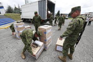 (250208) -- QUITO, 8 febrero, 2025 (Xinhua) -- Militares descargan cajas con urnas y papeletas electorales previo a las elecciones presidenciales y legislativas, en la ciudad de Quito, Ecuador, el 8 de febrero de 2025. Más de 13,7 millones de electores, dentro y fuera del país, están convocados a las urnas para elegir presidente y vicepresidente, así como 151 legisladores que integrarán la Asamblea Nacional y cinco representantes al Parlamento Andino. (Xinhua/Ricardo Landeta) (rl) (oa) (da)