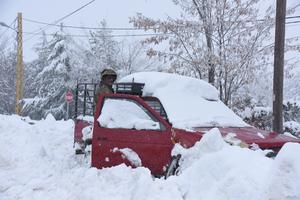 (250208) -- BSHARRI, 8 febrero, 2025 (Xinhua) -- Imagen del 7 de febrero de 2025 de un hombre permaneciendo junto a un vehículo cubierto de nieve, en Bisharri, Líbano. (Xinhua/Khaled Habashiti) (oa) (da)