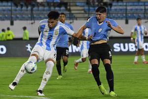 (250208) -- CARACAS, 8 febrero, 2025 (Xinhua) -- Imagen del 7 de febrero de 2025 del jugador Renzo Machado (d), de Uruguay, disputando el balón con Juan Giménez (i), de Argentina, durante el partido correspondiente a la segunda fecha de la fase final del torneo Sudamericano Sub-20 de la Confederación Sudamericana de Fútbol (Conmebol), celebrado en el Estadio Olímpico Nacional Brígido Iriarte, en Caracas, Venezuela. (Xinhua/Marcos Salgado) (ms) (oa) (da)