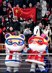 (250212) -- HARBIN, 12 febrero, 2025 (Xinhua) -- Mascotas reaccionan con los espectadores durante el partido del grupo A de la ronda preliminar de hockey sobre hielo femenino entre China y República de Corea en los IX Juegos Asiáticos de Invierno, en Harbin, en la provincia de Heilongjiang, en el noreste de China, el 12 de febrero de 2025. (Xinhua/Li Jianan) (ah) (ra) (vf)