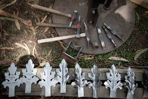 (250216) — BUENOS AIRES, 16 febrero, 2025 (Xinhua) — Elementos ornamentales realizados en chapa batida en frío son vistos junto a herramientas durante la cuarta edición del Encuentro Internacional de Herrería Artística, en el Museo de Esculturas Luis Perlotti y Forjadores Argentinos, en la ciudad de Buenos Aires, Argentina, el 16 de febrero de 2025. Artesanos de la herrería de todo el mundo se dieron cita durante cuatro días en la ciudad argentina de Buenos Aires para revivir el tradicional oficio y transmitir su pasión a las nuevas generaciones. (Xinhua/Martín Zabala) (mz) (rtg) (da)