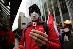 (250216) -- VANCOUVER, 16 febrero, 2025 (Xinhua) -- Imagen del 15 de febrero de 2025 de un hombre cargando una bandera nacional canadiense pequeña en una manifestación por el Día Nacional de la Bandera de Canadá, en Vancouver, Columbia Británica, Canadá. El Día Nacional de la Bandera de Canadá se celebró el 15 de febrero para conmemorar la inauguración de la bandera nacional de Canadá en 1965. (Xinhua/Liang Sen) (oa) (da)