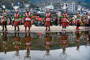 (250216) -- KAILI, 16 febrero, 2025 (Xinhua) -- Niñas del grupo étnico miao realizan una danza en celebración del festival Gannangxiang, en el poblado de Zhouxi de Kaili, en la prefectura autónoma miao y dong de Qiandongnan, en la provincia de Guizhou, en el suroeste de China, el 16 de febrero de 2025. En Kaili, el pueblo étnico local miao tiene la costumbre de portar su vestimenta tradicional y tocar Lusheng, un instrumento musical tradicional, para regocijarse en el festival anual Gannangxiang, una celebración tradicional en Guizhou durante el primer mes del calendario lunar chino. (Xinhua/Yang Wenbin) (rtg) (ah)