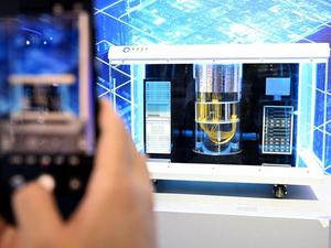 (240920) -- HEFEI, Sept. 20, 2024 (Xinhua) -- A visitor takes photos of an Origin Wukong superconducting quantum computer model at the 2024 World Manufacturing Convention in Hefei, east China's Anhui Province, Sept. 20, 2024. The 2024 World Manufacturing Convention opened Friday in Hefei, capital of east China's Anhui Province, highlighting the latest products and innovations in the manufacturing sector. Themed "Intelligent Manufacturing for a Better Future," the four-day event boasts a total exhibition area of 20,000 square meters and includes exhibitions, forums and seminars. (Xinhua/Huang Bohan)