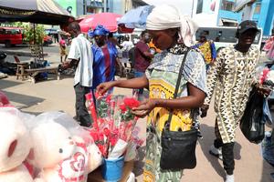 (250215) -- ABIYÁN, 15 febrero, 2025 (Xinhua) -- Imagen del 14 de febrero de 2025 de una vendedora de flores arreglando ramos de rosas en el Día de San Valentín, en Abiyán, Cote d'Ivoire. (Xinhua/Yvan Sonh) (oa) (da)