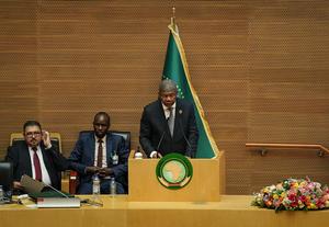 (250216) -- ADIS ABEBA, 16 febrero, 2025 (Xinhua) -- Imagen del 15 de febrero de 2025 del presidente de Angola, Joao Lourenco, hablando en su discurso de aceptación en la apertura de la 38 Sesión Ordinaria de la Asamblea de Jefes de Estado y de Gobierno de la Unión Africana (UA), en Adis Abeba, Etiopía. Lourenco asumió el sábado la presidencia rotatoria de la UA. (Xinhua/Han Xu) (oa) (da)