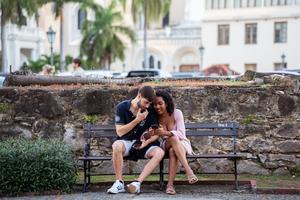 (250215) -- CIUDAD DE PANAMA, 15 febrero, 2025 (Xinhua) -- Imagen del 14 de febrero de 2025 de una pareja conversando en una banca en el Día de San Valentín, en el Casco Antiguo de la Ciudad de Panamá, en Panamá. (Xinhua/Xu Yongzheng) (oa) (da)