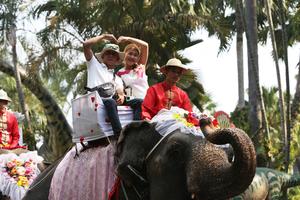 (250214) -- PATTAYA, 14 febrero, 2025 (Xinhua) -- Una pareja monta un elefante durante una ceremonia de boda masiva en el Jardín Tropical Nong Nooch, en Pattaya, Tailandia, el 14 de febrero de 2025. Nueve parejas se casaron mientras montaban elefantes aquí el viernes en una ceremonia de boda masiva del Día de San Valentín. (Xinhua/Rachen Sageamsak) (oa) (ra) (vf)