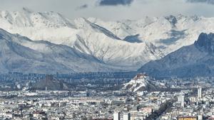 (250217) -- LHASA, 17 febrero, 2025 (Xinhua) -- Vista aérea tomada con un dron el 16 de febrero de 2025 de un paisaje nevado, en Lhasa, en la región autónoma Xizang, en el suroeste de China. (Xinhua/Jigme Dorje) (oa) (rtg) (ah)