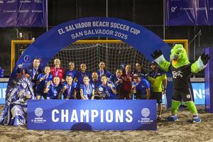 (250217) -- SAN SALVADOR, 17 febrero, 2025 (Xinhua) -- Imagen del 16 de febrero de 2025 de jugadoras de la selección nacional femenina de El Salvador, festejando al obtener el primer lugar, durante la jornada final femenina del Beach Soccer Cup El Salvador 2025, en el estadio de fútbol playa "Flor Blanca", en el departamento de San Salvador, El Salvador. (Xinhua/Alexander Peña) (ap) (rtg) (oa) (vf)
