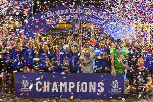 (250217) -- SAN SALVADOR, 17 febrero, 2025 (Xinhua) -- Imagen del 16 de febrero de 2025 de jugadoras de la selección nacional femenina de El Salvador y jugadores de la selección nacional masculina de Portugal, festejando al obtener los primeros lugares durante la jornada final del Beach Soccer Cup El Salvador 2025, en el estadio de fútbol playa "Flor Blanca", en el departamento de San Salvador, El Salvador. (Xinhua/Alexander Peña) (ap) (rtg) (oa) (vf)