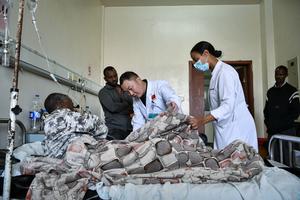 (250217) -- ADIS ABEBA, 17 febrero, 2025 (Xinhua) -- Imagen del 14 febrero de 2025 del doctor chino, Li Hao, miembro del 25 equipo médico chino enviado a Etiopía, examinando la recuperación de un paciente postoperado con personal médico local en la sala del Hospital General Tirunesh de Beijing, en Adis Abeba, Etiopía. El 25 equipo médico chino enviado a Etiopía llegó al país en mayo de 2024 y ha estado prestando servicios médicos a pacientes locales y formando a médicos locales. También se construyó el Hospital General de Beijing Tirunesh como parte de los esfuerzos de asistencia de larga data del gobierno chino. (Xinhua/Han Xu) (oa) (rtg) (vf)