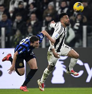 (250217) -- TURIN, 17 febrero, 2025 (Xinhua) -- Imagen del 16 de febrero de 2025 de Nicolás González (d), de Juventus, disputando el balón con Benjamin Pavard, de Inter de Milán, durante un partido de fútbol de la Serie A entre el FC Juventus y el Inter de Milán, en Turín, Italia. (Xinhua/Alberto Lingria) (oa) (rtg) (vf)