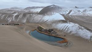 (250218) -- DUNHUANG, 18 febrero, 2025 (Xinhua) -- Vista aérea tomada con un dron el 23 de noviembre de 2024 de la montaña Mingsha y el punto escénico de la primavera creciente, en Dunhuang, en la provincia de Gansu, en el noroeste de China. En los últimos años, Dunhuang ha aprovechado sus recursos de turismo cultural y ha atraído vigorosamente a visitantes y estudiosos de todo el mundo interesados en profundizar en su importancia histórica y presenciar su renacimiento cultural moderno. Alguna vez sirvió durante miles de años como punto de encuentro de Oriente y Occidente a lo largo de la antigua Ruta de la Seda, Dunhuang ahora ha revivido para acoger un nuevo desarrollo. (Xinhua/Zhang Xiaoliang) (oa) (ah) (vf)