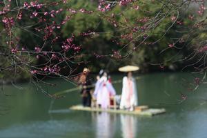 (250218) -- HANGZHOU, 18 febrero, 2025 (Xinhua) -- Personas en trajes tradicionales disfrutan de las flores del ciruelo mientras navegan en una balsa de bambú en el Parque Nacional de Humedales Xixi, en Hangzhou, en la provincia de Zhejiang, en el este de China, el 18 de febrero de 2025. El humedal de Xixi, en Hangzhou, ha entrado en la mejor temporada para contemplar las flores de ciruelo. (Xinhua/Huang Zongzhi) (oa) (ah) (ce)