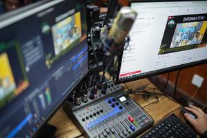 (250218) — BOGOTA, 18 febrero, 2025 (Xinhua) — Imagen del 17 de febrero de 2025 de una persona controlando una consola durante la emisión de un programa de Ondas Opiac, la emisora de los pueblos indígenas que transmite desde las instalaciones de la Organización Nacional de los Pueblos Indígenas de la Amazonia Colombiana (Opiac), en Bogotá, Colombia. En una antigua casona ubicada en el centro de la ciudad de Bogotá, sede de la Opiac funciona la emisora digital Ondas Opiac, una iniciativa de comunicación que busca fortalecer los lazos en los territorios amazónicos y expandir sus saberes ancestrales hacia el resto del mundo. (Xinhua/Andrés Moreno) (am) (rtg) (oa) (ah) (vf)