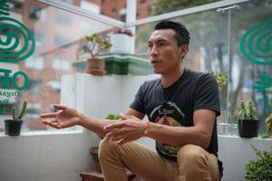 (250218) — BOGOTA, 18 febrero, 2025 (Xinhua) — Imagen del 17 de febrero de 2025 del reportero, locutor y productor radial, Rafael Arbeláez, hablando durante una entrevista sobre Ondas Opiac, la emisora de los pueblos indígenas que transmite desde las instalaciones de la Organización Nacional de los Pueblos Indígenas de la Amazonia Colombiana (Opiac), en Bogotá, Colombia. En una antigua casona ubicada en el centro de la ciudad de Bogotá, sede de la Opiac, funciona la emisora digital Ondas Opiac, una iniciativa de comunicación que busca fortalecer los lazos en los territorios amazónicos y expandir sus saberes ancestrales hacia el resto del mundo. (Xinhua/Andrés Moreno) (am) (rtg) (oa) (ah) (vf)