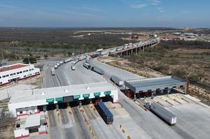 (250218) -- NUEVO LEON, 18 febrero, 2025 (Xinhua) -- Vista aérea tomada con un dron el 15 de febrero de 2025 de camiones pasando por un puesto de control cerca del Puente Internacional Solidaridad Laredo-Colombia, en la comunidad de Colombia, Nuevo León, México. México y Estados Unidos comparten una línea fronteriza de más de 3.100 kilómetros, con la sección oriental definida principalmente por el Río Bravo. (Xinhua/Li Mengxin) (oa) (ah) (ce)