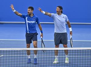 (250218) -- DOHA, 18 febrero, 2025 (Xinhua) -- Imagen del 17 de febrero de 2025 de Novak Djokovic (i)/Fernando Verdasco festejando al término del partido de octavos de final de dobles masculinos entre Alexander Bublik, de Kazajistán/Karen Khachanov, de Rusia, y Novak Djokovic, de Serbia/Fernando Verdasco, de España, en el torneo de tenis Abierto de Qatar de la ATP, en Doha, Qatar. (Xinhua/Nikku) (jg) (ra) (vf)