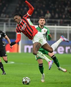 (250219) -- MILAN, 19 febrero, 2025 (Xinhua) -- Imagen del 18 de febrero de 2025 de Rafael Leao (frente), de AC Milan, disputando el balón durante el partido de fútbol de vuelta de play-off de la fase eliminatoria de la Liga de Campeones de la UEFA entre AC Milan y Feyenoord, en Milán, Italia. (Xinhua/Alberto Lingria) (ah) (ra) (vf)