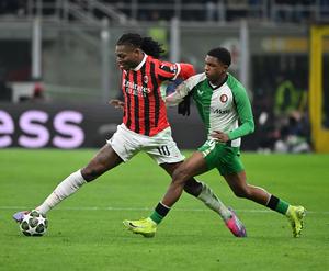 (250219) -- MILAN, 19 febrero, 2025 (Xinhua) -- Imagen del 18 de febrero de 2025 de Rafael Leao (i), de AC Milan, disputando el balón con Givairo Read, de Feyenoord, durante el partido de fútbol de vuelta de play-off de la fase eliminatoria de la Liga de Campeones de la UEFA entre AC Milan y Feyenoord, en Milán, Italia. (Xinhua/Alberto Lingria) (ah) (ra) (vf)