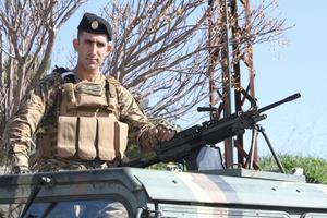 (250219) -- KAFR KILA, 19 febrero, 2025 (Xinhua) -- Imagen del 18 de febrero de 2025 de un miembro del Ejército libanés posicionándose en la entrada de Kafr Kila, Líbano. El Ejército israelí se retiró el martes de las áreas fronterizas del sur de Líbano, pero permaneció en cinco posiciones, dijo un funcionario israelí, a pesar de la expiración de la fecha límite para una retirada total conforme a un acuerdo de cese al fuego con Hizbulá. (Xinhua/Taher Abu Hamdan) (jg) (da) (ce)