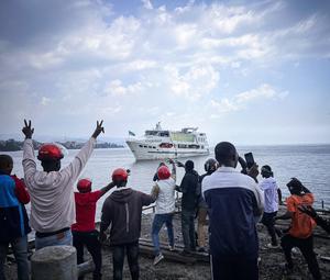 (250219) -- GOMA, 19 febrero, 2025 (Xinhua) -- Imagen del 18 de febrero de 2025 de personas animando a un ferry que se acerca a un muelle, en Goma, República Democrática del Congo (RDC). El tráfico en el lago Kivu entre Bukavu y Goma, dos capitales de provincia en el este de la RDC, se reanudó el martes después de semanas de suspensión debido a los enfrentamientos en Goma. (Xinhua/Zanem Nety Zaidi) (ah) (ra) (ce)