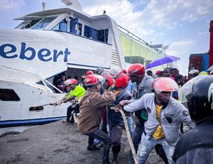 (250219) -- GOMA, 19 febrero, 2025 (Xinhua) -- Imagen del 18 de febrero de 2025 de trabajadores jalando un ferry hacia el embarcadero en un muelle, en Goma, República Democrática del Congo (RDC). El tráfico en el lago Kivu entre Bukavu y Goma, dos capitales de provincia en el este de la RDC, se reanudó el martes después de semanas de suspensión debido a los enfrentamientos en Goma. (Xinhua/Zanem Nety Zaidi) (ah) (ra) (ce)