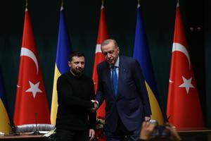 (250219) -- ANKARA, 19 febrero, 2025 (Xinhua) -- Imagen del 18 de febrero de 2025 del presidente turco, Recep Tayyip Erdogan (d), estrechando la mano con el presidente ucraniano, Volodymyr Zelensky, en el Complejo Presidencial, en Ankara, Turquía. Zelensky llegó a Ankara el lunes para reunirse con el presidente turco, Recep Tayyip Erdogan, informó la emisora estatal TRT. (Xinhua/Mustafa Kaya) (ah) (ra) (vf)