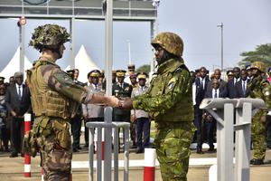 (250221) -- ABIYAN, 21 febrero, 2025 (Xinhua) -- Imagen del 20 de febrero de 2025 de soldados franceses y marfileños asistiendo a una ceremonia oficial de entrega en el campamento militar, en Abiyán, Cote d'Ivoire. Francia transfirió oficialmente el jueves el control de su única base militar en Cote d'Ivoire, el campamento del 43º Batallón de Infantería de Marina, a las autoridades de la nación de Africa Occidental. (Xinhua/Yvan Sonh) (oa) (ra) (ce)