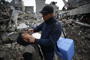 (250223) -- GAZA, 23 febrero, 2025 (Xinhua) -- Imagen del 22 de febrero de 2025 de un niño palestino recibiendo una dosis de vacuna contra la polio, en Jabalia, en el norte de la Franja de Gaza. (Xinhua/Mahmoud Zaki) (rtg) (ah)