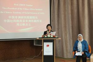 (250223) -- TÚNEZ, 23 febrero, 2025 (Xinhua) -- Imagen del 22 de febrero de 2025 de Zhou Yunfan (i), vicepresidenta del Instituto China-Africa, hablando durante la conferencia sobre China en el Instituto Superior de Lenguas de Túnez (ISLT), en Túnez, Túnez. La 22 Conferencia sobre China se celebró aquí el sábado, con más de 100 participantes de la diplomacia, universidades e instituciones de investigación de China y Túnez. (Xinhua/Huang Ling) (oa) (ah)