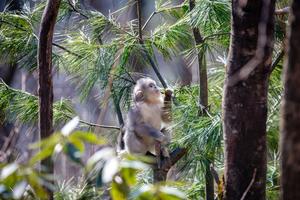 (250311) -- SHANGRI-LA, 11 marzo, 2025 (Xinhua) -- Imagen del 10 de marzo de 2025 de un mono de nariz chata visto en la Reserva Natural Nacional de la Montaña Nevada de Baima, en la provincia de Yunnan, en el suroeste de China. El mono de nariz chata blanco y negro, también conocido como mono de pelo dorado de Yunnan, es un animal protegido de primera clase a nivel nacional de China. La especie también figura en la Lista Roja de la Unión Internacional para la Conservación de la Naturaleza (UICN). (Xinhua/Hu Chao) (jg) (ra) (vf)