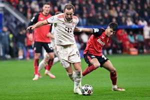 (250312) -- LEVERKUSEN, 12 marzo, 2025 (Xinhua) -- Imagen del 11 de marzo de 2025 de Exequiel Palacios (d), de Bayer 04 Leverkusen, disputando el balón con Harry Kane, de Bayern Munich, durante el partido de fútbol de vuelta de octavos de final de la Liga de Campeones de la UEFA entre Bayer 04 Leverkusen y Bayern Munich, en Leverkusen, Alemania. (Xinhua/Ulrich Hufnagel) (ah) (ra) (vf)