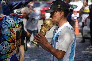 (250312) -- BUENOS AIRES, 12 marzo, 2025 (Xinhua) -- Imagen del 11 de marzo de 2025 de un hombre besando una réplica del trofeo de la Copa del Mundo afuera del tribunal, en Buenos Aires, capital de Argentina. Un tribunal argentino comenzó el martes el juicio de siete profesionales de la salud acusados de negligencia en la muerte del ex futbolista Diego Maradona. (Xinhua/Zhang Duo) (jg) (da) (vf)