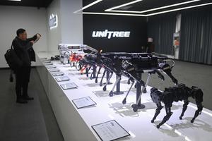(250312) -- HANGZHOU, 12 marzo, 2025 (Xinhua) -- Imagen del 20 de febrero de 2025 de un visitante tomando fotografías de los perros robóticos en la sala de exposiciones de Unitree Robotics, en Hangzhou, en la provincia de Zhejiang, en el este de China. China amplía su presencia en robótica humanoide en medio del auge de la industria. (Xinhua/Huang Zongzhi) (jg) (da) (ce)