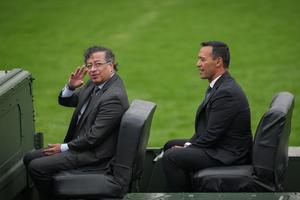 (250311) -- BOGOTÁ, 11 marzo, 2025 (Xinhua) -- El presidente colombiano, Gustavo Petro (i), y el nuevo ministro de Defensa colombiano, Pedro Sánchez Suárez (d), participan durante la ceremonia militar de reconocimiento de tropas, en la Escuela Militar José María Córdova, en Bogotá, Colombia, el 11 de marzo de 2025. (Xinhua/Andrés Moreno) (am) (jg) (ra) (ce)