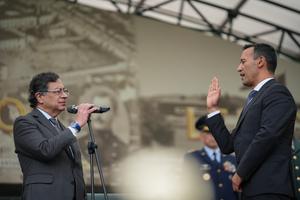 (250311) -- BOGOTÁ, 11 marzo, 2025 (Xinhua) -- El presidente colombiano, Gustavo Petro (i), toma juramento del cargo al nuevo ministro de Defensa colombiano, Pedro Sánchez Suárez (d), durante la ceremonia militar de reconocimiento de tropas, en la Escuela Militar José María Córdova, en Bogotá, Colombia, el 11 de marzo de 2025. (Xinhua/Andrés Moreno) (am) (jg) (ra) (ce)