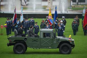 (250311) -- BOGOTÁ, 11 marzo, 2025 (Xinhua) -- El presidente colombiano, Gustavo Petro (2-i-frente), y el nuevo ministro de Defensa colombiano, Pedro Sánchez Suárez (i-frente), participan durante la ceremonia militar de reconocimiento de tropas, en la Escuela Militar José María Córdova, en Bogotá, Colombia, el 11 de marzo de 2025. (Xinhua/Andrés Moreno) (am) (jg) (ra) (ce)