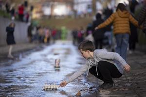 (250312) -- LIUBLIANA, 12 marzo, 2025 (Xinhua) -- Imagen del 11 de marzo de 2025 de un niño dejando que su barco casero en miniatura descienda por el arroyo durante un evento para celebrar la llegada de la primavera, en Liubliana, Eslovenia. (Xinhua/Zeljko Stevanic) (jg) (da) (vf)