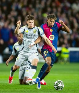 (250312) -- BARCELONA, 12 marzo, 2025 (Xinhua) -- Imagen del 11 de marzo de 2025 de Lamine Yamal (d), de Barcelona, disputando el balón con Samuel Dahl, de Benfica, durante el partido de fútbol de vuelta de octavos de final de la Liga de Campeones de la UEFA entre FC Barcelona y SL Benfica, en Barcelona, España. (Xinhua/Joan Gosa) (ah) (ra) (ce)