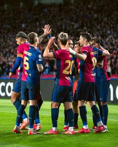 (250312) -- BARCELONA, 12 marzo, 2025 (Xinhua) -- Imagen del 11 de marzo de 2025 de Lamine Yamal (d), de Barcelona, festejando su anotación con sus compañeros durante el partido de fútbol de vuelta de octavos de final de la Liga de Campeones de la UEFA entre FC Barcelona y SL Benfica, en Barcelona, España. (Xinhua/Joan Gosa) (ah) (ra) (ce)