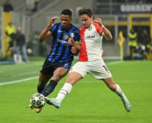 (250312) -- MILÁN, 12 marzo, 2025 (Xinhua) -- Imagen del 11 de marzo de 2025 de Denzel Dumfries (i), de Inter de Milán, disputando el balón con Hugo Bueno, de Feyenoord, durante el partido de vuelta de octavos de final de la Liga de Campeones de la UEFA entre Inter de Milán y Feyenoord, en Milán, Italia. (Xinhua/Alberto Lingria) (ah) (ra) (ce)